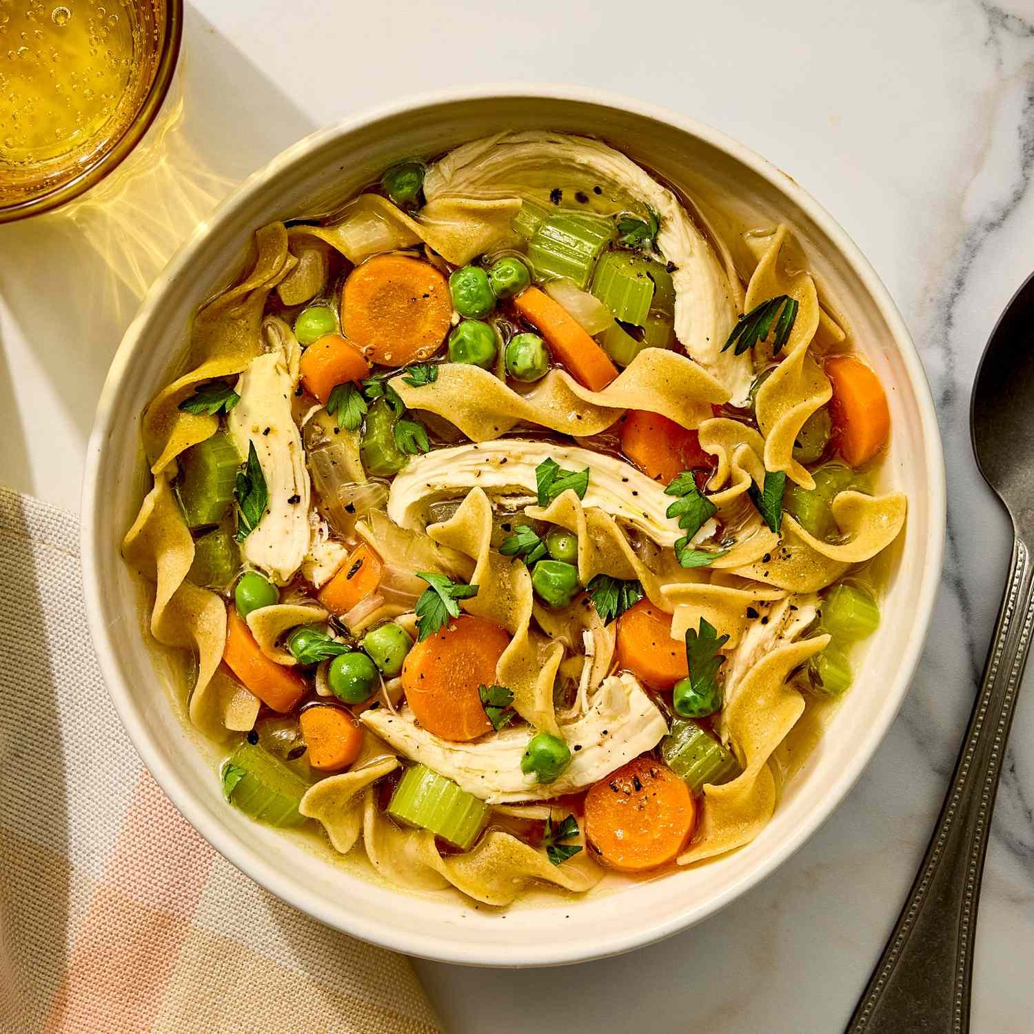Classic chicken noodle soup gets a healthy upgrade with low-sodium chicken broth, whole-wheat egg noodles and tons of vegetables. To get a homemade stock flavor using store-bought broth, we simmer bone-in chicken breasts in the broth before adding the rest of the soup ingredients. But you’re short on time, feel free to use pre-cooked chicken and start the recipe at step 2.
