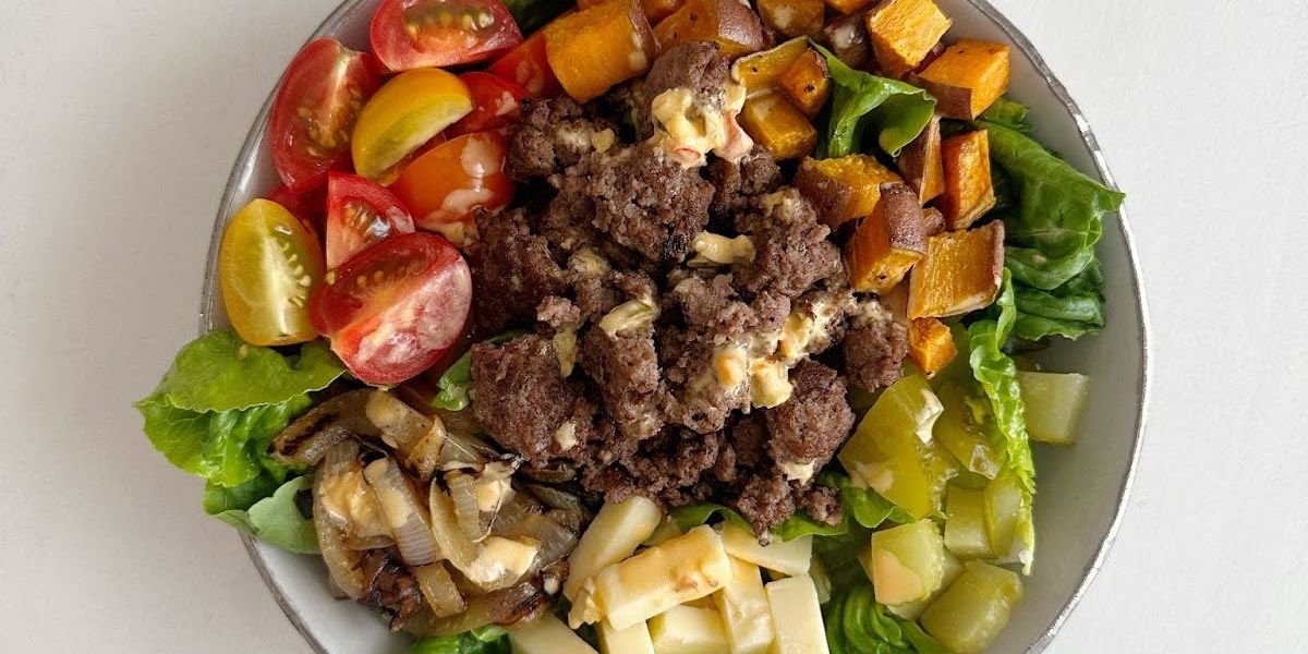 Nothing says summer quite like a cookout. Luckily, this lightened-up burger salad, inspired by this recipe from Carina Wolff of Kale Me Maybe, allows you to enjoy the best of barbecue season without falling into a food coma. It’s chock-full of pickles, sharp cheddar, and caramelized onions, plus antioxidant-rich veggies like sweet potatoes and in-season tomatoes. You’ll hardly miss the bun.
