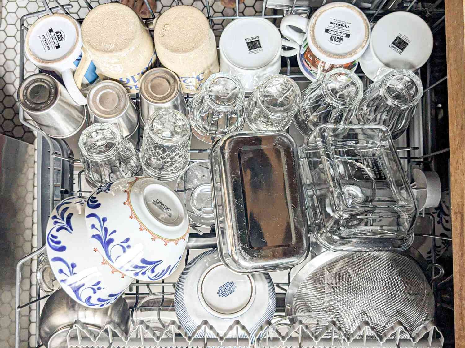 The bottom line is that it comes down to thinking about water access to each item in the dishwasher—the goal is to pack everything in as tightly as possible without allowing any object to block another from the water.