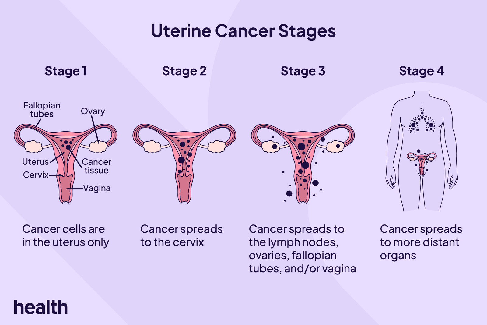 If you have stage 4 uterine cancer, the disease has spread to distant sites of your body beyond the pelvis like your bones, liver, or lungs. It also may or may not be in your lymph nodes. Symptoms of this stage are similar to the other stages. However, you may also experience symptoms related to the location of the cancer, such as difficulty breathing if the cancer is in your lungs.